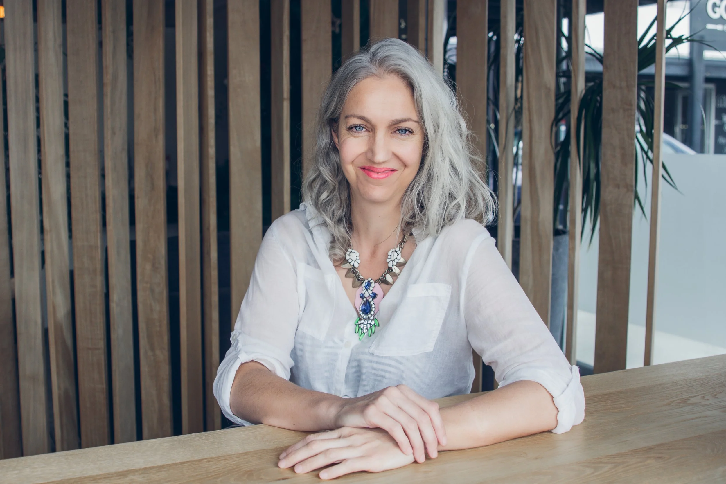 A woman with gray curly hair sitting at a wooden table, smiling, wearing a light-colored blouse and a colorful statement necklace, in a modern interior with wooden slats and indoor plants.